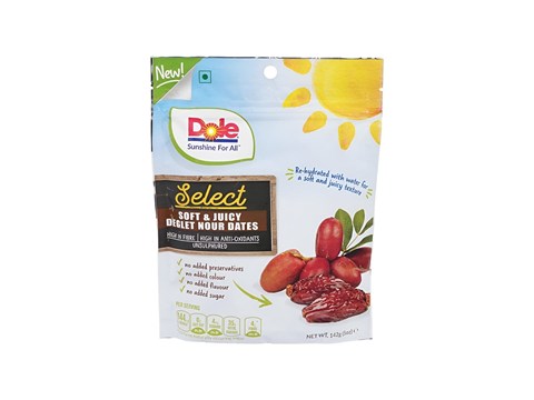 Dole Select Soft & Juicy Deglet Nour Dates, 142 g is a naturally sweet, nutrient-rich superfood, ideal for clean snacking and healthy recipes. Loaded with fibre, antioxidants and essential minerals, it adds quiet nutrition to everyday meals. Enjoy it as a daily energy bite, blend it into smoothies, sprinkle on yogurt, or stir into oats and salads. It’s a smart sugar replacement in laddus, energy bars, baking and festive sweets. Carefully cleaned and packed to preserve flavour, texture and natural goodness. Store in an airtight container in a cool, dry place; refrigerate after opening for longer freshness. A wholesome pantry pick for anyone looking to snack better without compromising on taste.